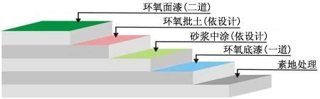 ①防水处理:一楼地面需已做好防水处理;②素地处理:依素地状况做好打磨、修补、除尘;③环氧底漆:采用渗透性及附着力特强环氧底漆滚涂一道,增强表面附着力;④环氧中涂:将环氧树脂加入适量的石英砂,用镘刀将其均匀涂布数道;⑤环氧批土:依实际需要施工数道,要求达到平整无孔洞,无批刀印及砂磨印为准;⑥环氧面漆:溶济型环氧面漆或止滑面漆滚涂二道,完工后整体地面光亮洁净,颜色均一,无空鼓;⑦施工完成:24小时后方可上人,72小时后方可重压。(25℃为准,低温开放时间需适度延长)